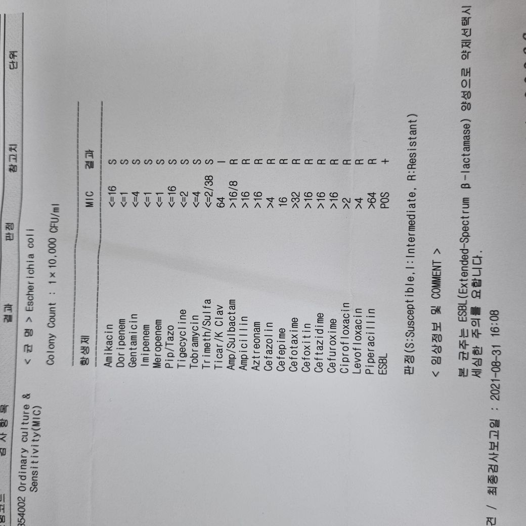 이 결과지는 핸드폰에 저장 하셔서 다음에 혹시 요로감염 의심될때 이전에 ESBL 대장균이 나왔었다~ 라고 의사에게 말하면 다들 알아들으실 겁니다.