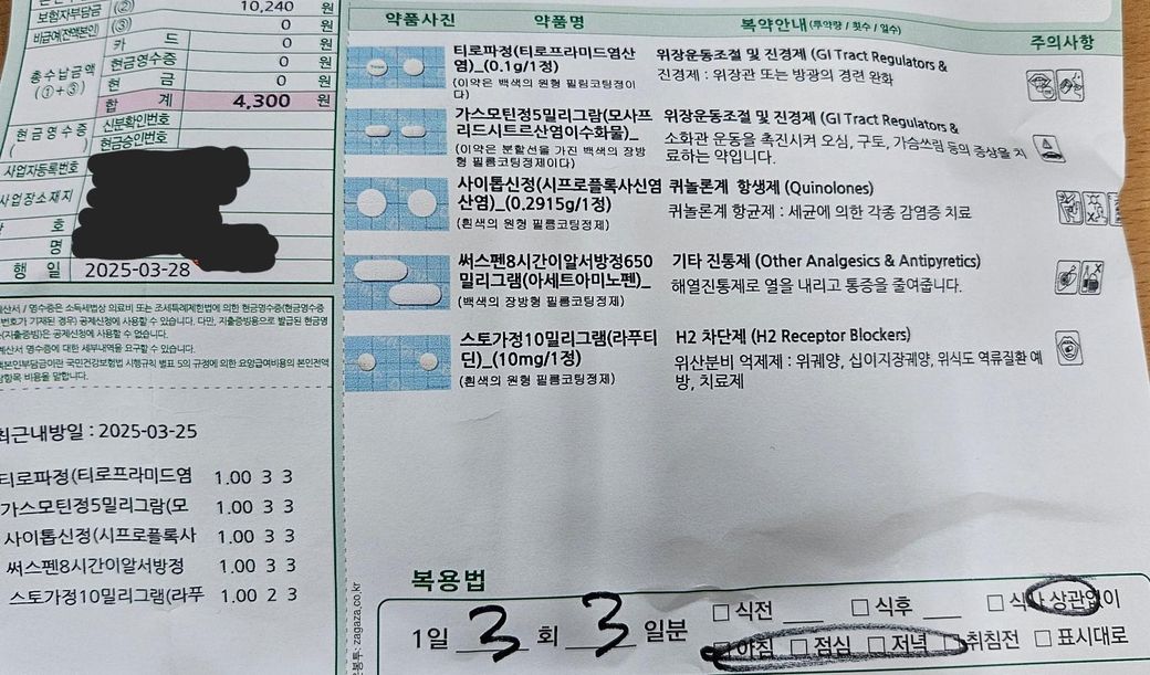 스토가정은 최소 8시간 떨어뜨려 복용해야 하는 약이고 대신 다른 약들은 항생제도 있기 때문에 4~6시간 사이 간격으로 복용하는 것을 권해드리는데요, 시간 간격이 맞지 않으니 오늘은 저녁약 드실 때 스토가정만 빼고 드시는 것을 추천드립니다^^