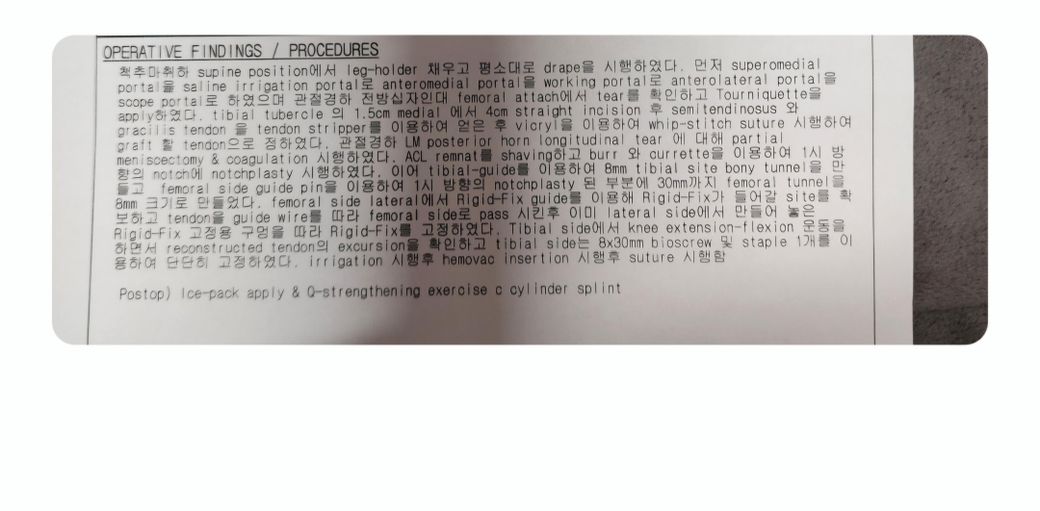 전방십자인대 재건술을 받으셨나요? 수술과정에 대한 기록으로 보이는데요, 특별한 이상없이 기록상에는 수술이 진행된 것으로 보이며, 수술이후 아이스팩과 큐세팅운동등의 처방이 있는것으로 보여집니다.
