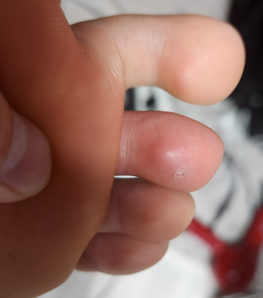 붉은 정중앙 부위를 의미하시는 것이라면 굳은살 및 표재성 감염등을 의심해 볼 수 있고 그 옆의 하얗게 올라온 부분이라면 티눈, 사마귀 등을 의심해 볼 수 있겠습니다.