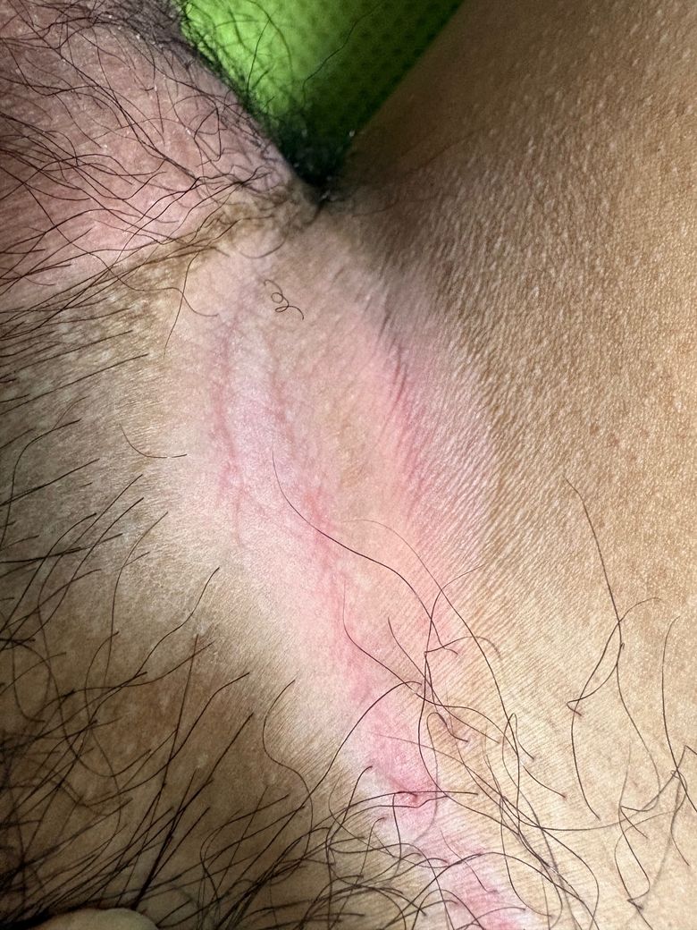 사진과 설명을 종합하면 사타구니 백선이 지나간 뒤 남는 변화일 가능성이 높습니다. 이전에 백선으로 의심되던 병변이 있던 자리라는 점을 고려하면, 현재 보이는 하얗게 뜬 느낌은 곰팡이가 활발히 증식하는 상태라기보다는 염증 후 피부색 변화이거나, 반복된 습기와 마찰로 인한 경미한 간찰진 소견에 가깝습니다.