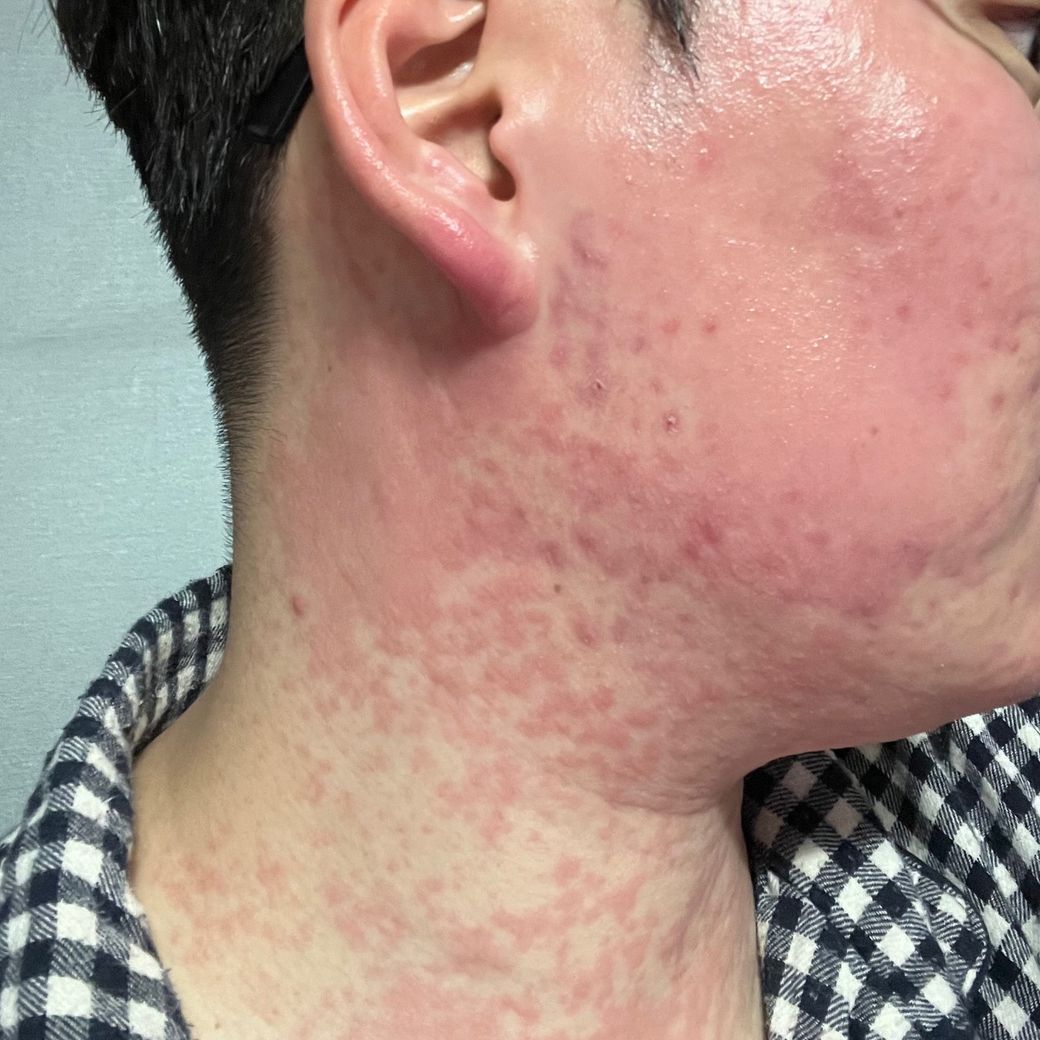 일요일 밤에 조금 붉은 증상이 있길래 그냥 건조해서 그런가보다 생각했어요 자고 일어나니 그 증상이 심해졌고 오늘은 이렇게까지 심해졌는데 이소티논 부작용에 이런 증상이 있나요? 아니면 음식 잘못먹어서 그런걸까요ㅠㅠ? 우선 약 복용중단하고 항히스타민이랑 스테로이드 복용하고 있습니다,,, 앞으로 계속 이소티논 복용 중단해야할까요?