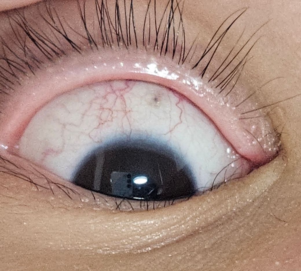 결막모반으로 보입니다. 피부에 점이 생기듯 안구에 생기는 점이라고 생각하면 됩니다. 보통 문제가되지 않아 그대로 두어도 되며, 제거를 원한다면 안과에서 제거도 가능합니다.