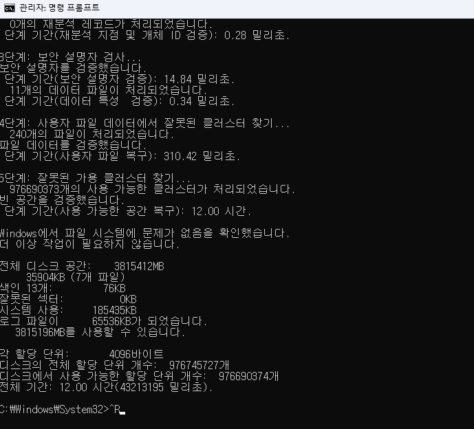해서 포맷한후 장장 12시간의 체크디스크 (/F/R)을 실행했습니다