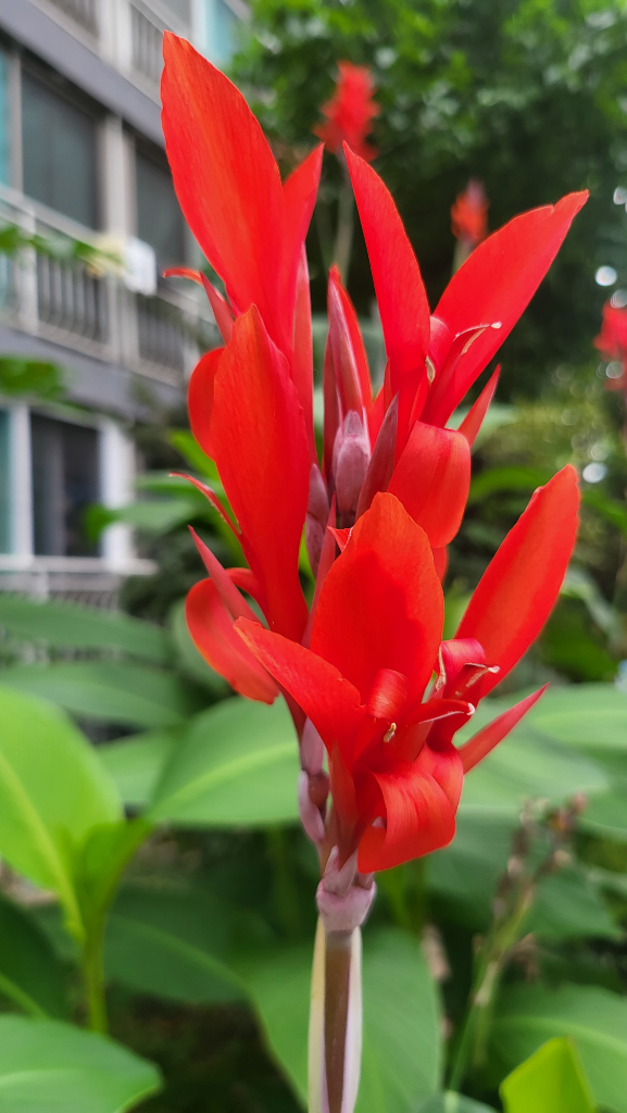 아파트 화단에 핀 이꽃은 잎이 넓고 바나나 잎사귀를 닮았어요, 생명력이 좋고 잘 자라는데 배양하기도 종은 화초 같아요, 이꽃의 이름이 궁금해요.