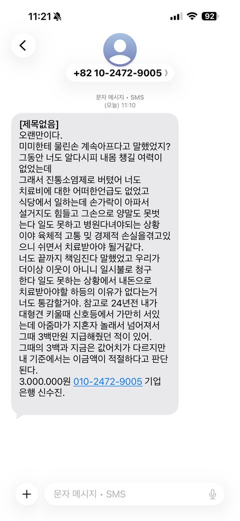 그런데 오늘 문자로 저희한테 그떄당시 저희 강아지에게 물린게 아직도 아프고 일상생활 조차 안된다고 하면서 치료비 명목으로 책임배상을 요구하면서 현금 300만원을 요구합니다 그러곤 자기도 옛날에 억울하게? 배상을 한적있다고 그예시를 들이밀면서 협박아닌 협박으로 저희에게 금전 요구를 하고있습니다 물림직후 정말 여러차레 치료비 주겠다고 했고 병원도 데려가려 했습니다 이제와서 본인이 돈필요해서 돈달라고 협박하는거 밖으로는 안보입니다 이런경우 어떻게 대처하고 저희가 역으로 고소할 방법이 있을까여? 사진은 오늘 받은 문자 내용입니다