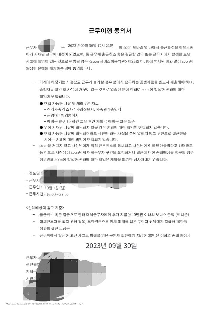 10월 1일 알바를 9월 30일에 지원해서 근무하기로 했는데 일이 생겨 근무 시작 23시간 전에 근무 취소를 했습니다.