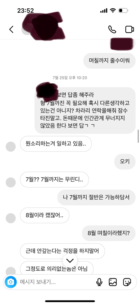 그 친구는 두달정도만에 캐디 교육기간 과정을 포기하고 다른일을 하러 갔고 이번달 8월 31일 말까지 100만원(늦어도 9월1일), 10월1일까지 나머지 100만원을 두달에 거쳐서 주기로 했는데, 일주일전에 sns차단, 카카오톡 차단, 전화번호까지 바꿨드라구요. 증거자료라고는 제가 메모장에 써놓은 장부와 최근에 인스타그램 dm으로 한 내용이 다입니다. (첨부)