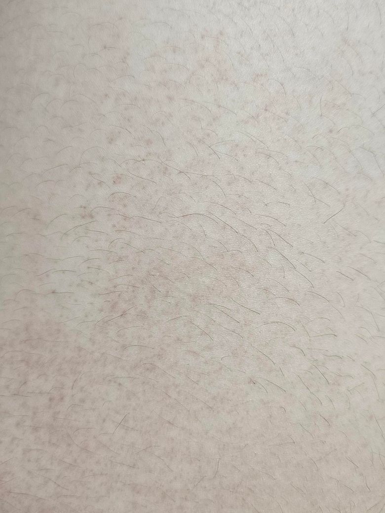 사진상으로는 모낭을 중심으로 작고 균일한 붉은 점들이 양측 허벅지 안쪽에 퍼져 보입니다. 융기나 수포, 진물은 뚜렷하지 않고, 대칭적이라는 점에서 급성 감염보다는 모공 관련 피부질환 가능성이 더 높습니다.
