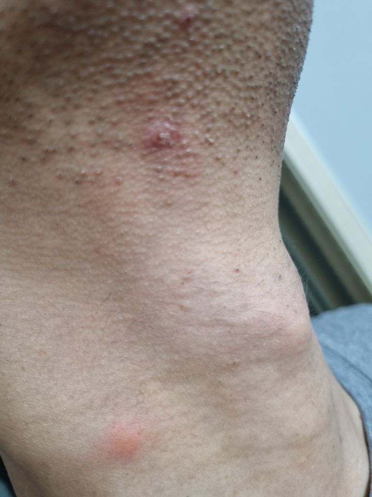 쯔쯔가무시라고 하기에는 물린 상처에 의한 가피가 보이지 않습니다.