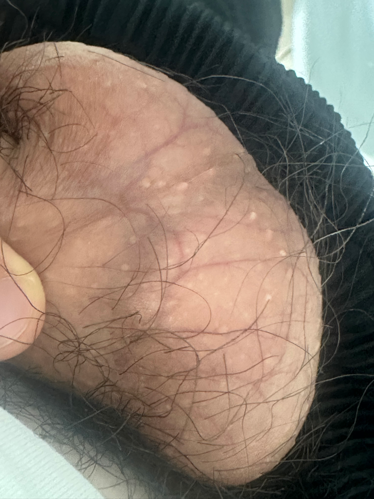 모공각화증 병변으로 보이며 변화가 관찰되거나 걱정스러우신 경우에 가까운 비뇨의학과에서 진료받아보시기 바랍니다.