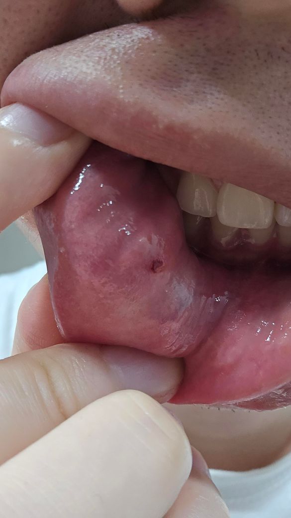 이빨로 깨물지 않더라도 구내염은 발생할 수 있습니다. 매독으로 인한 연성하감으로 보기에는 병변의 주변 경계가 지나치게 평평하여, 성병일 가능성은 높지 않습니다.