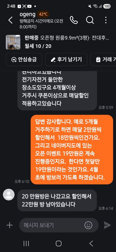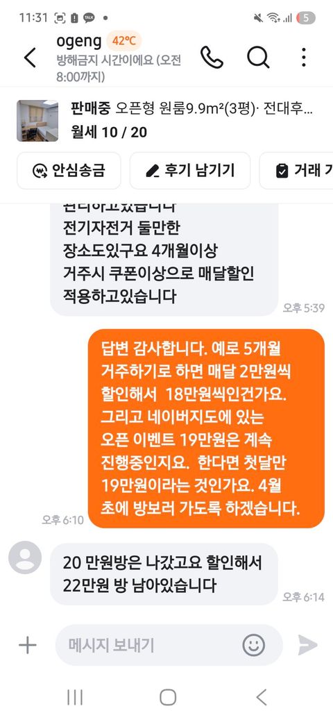 그리고 네이버나 고방 사이트에 나온 가격이랑 운영자가 실제 제시한 가격이랑 다릅니다. 다른 사람인척하고 고방 사이트에 나온 가격에 대해 문자로 자세히 물으면 그냥 거주기간에 따라 할인된다. 상담해주겠다고만 하네요...