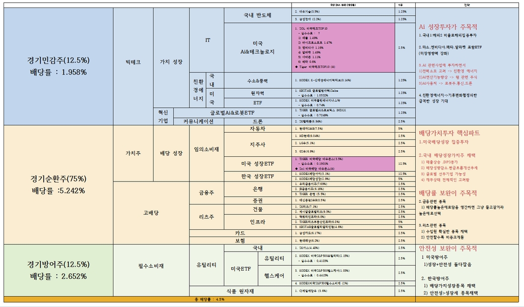 현재의 포트폴리오 구성은 다양화와 리스크 관리를 잘 반영하고 있습니다. 배당 재투자 전략을 통해 장기적인 자산 증식을 목표로 한다면, 안정적인 배당 주식과 배당 성장 ETF에 집중하는 것이 좋습니다. 주기적으로 포트폴리오를 점검하고, 시장 상황에 따라 조정하는 것이 중요합니다. 이러한 구성을 유지하며 장기적인 투자 계획을 실행하면 안정적이고 지속적인 수익을 기대할 수 있습니다.