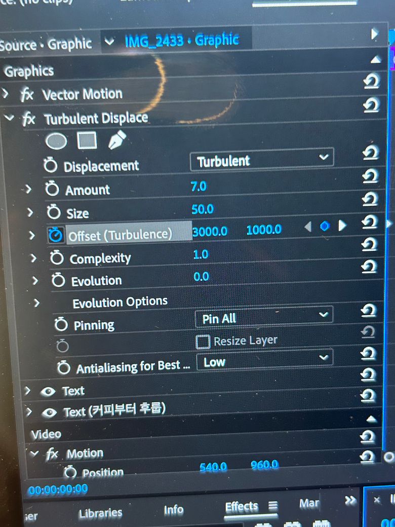 turbulent displace 효과의 키프레임 적용이 안 됩니다..