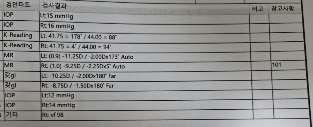 좌안 -9.25(난시 까지 고려하면 -10.5정도) 로 굉장히 심한 고도근시로 보입니다.