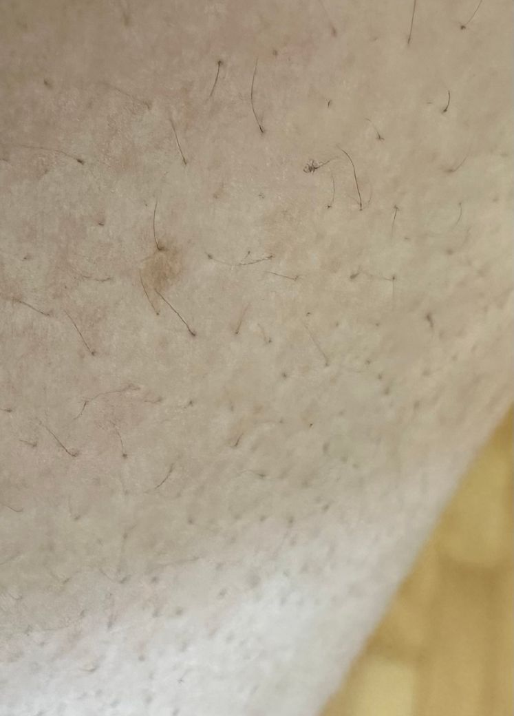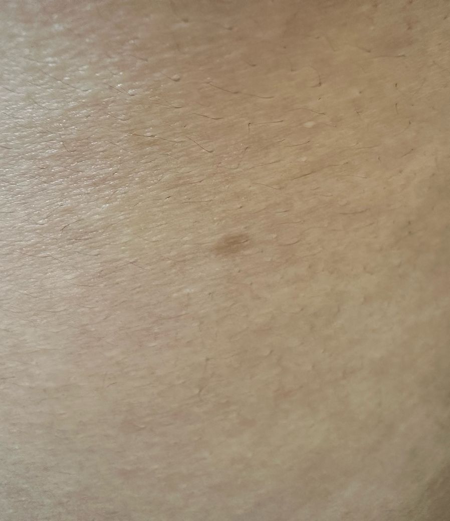 가장 가능성이 높은 것은 색소성 병변, 특히 다음 두 가지입니다. 첫째, 후천성 색소침착입니다. 모낭염, 미세한 피부 자극, 긁힘 이후에 국소적으로 멜라닌이 증가하면서 생기는 경우입니다. 둘째, 단순 색소모반(일반적인 점) 초기 형태입니다. 사진처럼 크기가 작고 균일한 색이면 이 범주에 포함되는 경우가 많습니다.
