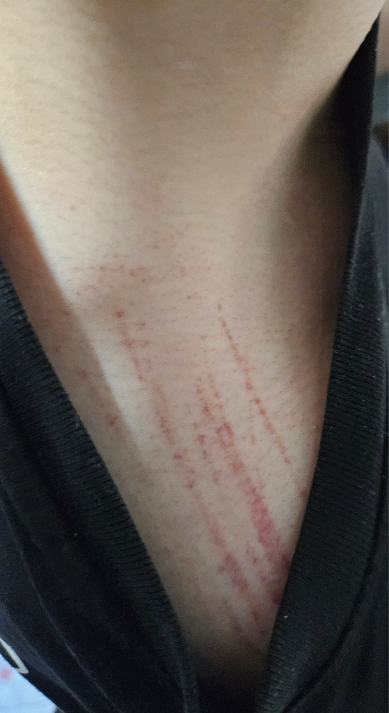 아래 사진과 같이 어느 순간 양쪽 어깨랑 목 뒤에 어디에 긁힌 것처럼 상처? 들이 생겼다가 시간 지나면 가라앉고 또 나중에 다시 생기고가 반복입니다 어디에 긁힌 적도 없는데 왜 생기는 걸까요?