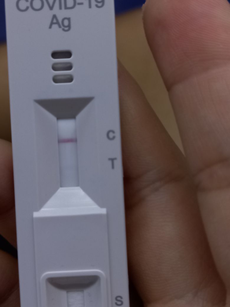 현재 자가진단키트 검사는 음성입니다. 희미하게 보이는 것은 크로마토그래피 원리로 인하여 나타나는 것이지 양성이기 때문에 아주 희미하게 나타난 것이 아닙니다. 양성이라면 진한 선이 나타나게 됩니다. 즉 지금은 음성으로 보는 것이 맞습니다.