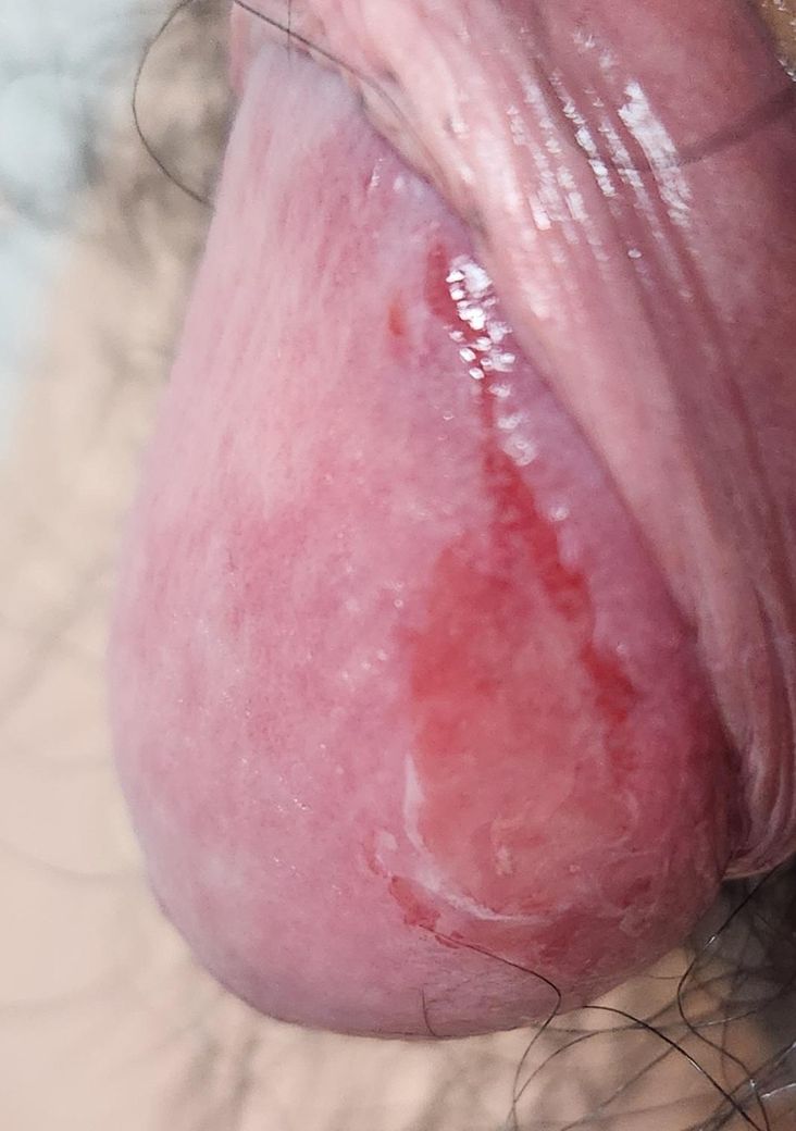 귀두 표피의 손상이 관찰되지만 손상의 깊이가 깊지 않아 큰 문제가 될 것으로 보이지는 않습니다. 겐트리손과 같은 항생제 연고는 이차 세균 감염을 예방하는데 도움이 될 수 있습니다. 따라서 겐트리손 연고를 사용해 보시고 내일 진료가 가능한 시간에 비뇨의학과 진료를 보아도 되겠습니다.