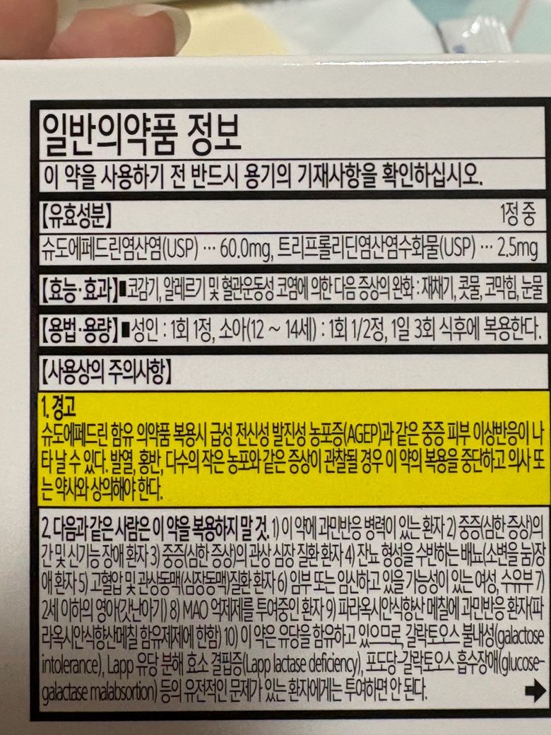 이 두 개 같이 먹어도 되나요? 배뇨장애가 있으면 먹지말라고 적혀있어서 의심돼요ㅠㅠ 지피티한테 물어보니까 콧물약에 소변이 나오지 않게 하는 뭐가 있다고 해서요