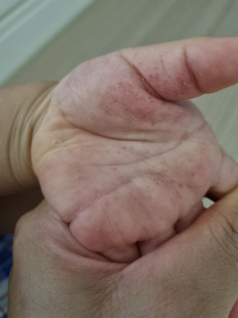 직접 신체 진찰이 필요하겠으나 손바닥 외 목젖 주변이나 입술, 입천장 등에 물집과 구내염이 동반될 경우 수족구병의 가능성이 생각되므로 소아과 진찰을 서둘러 받아볼 것을 권합니다.