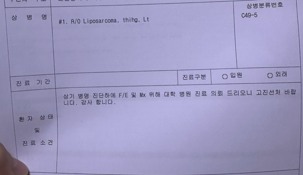 좌측허벅지의 지방육종 의심으로 적혀있어 아직 진단이 된것은 아니며 의심병변으로 적혀있기 때문에 상급병원에서 조직검사늘 진행해 보시는 것이 좋겠습니다