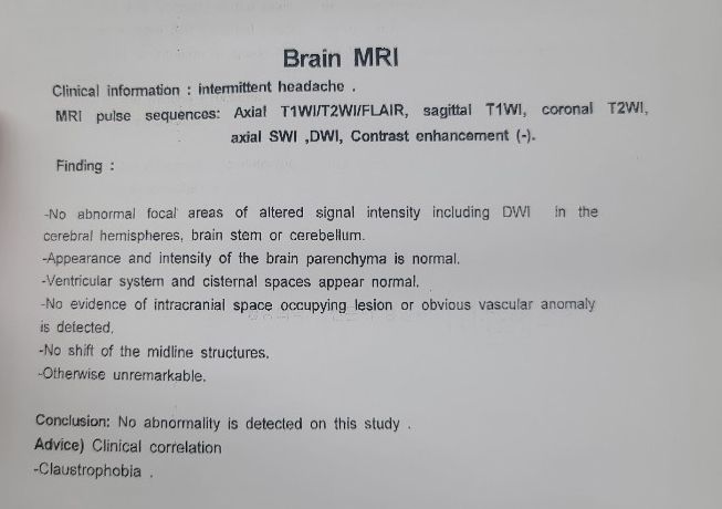 뇌실질 내 이상소견 없음, 두개내에 암같은 종양성 병변 없음 등등 다 뭐뭐가 없다는 말이므로 지극히 정상이십니다.
