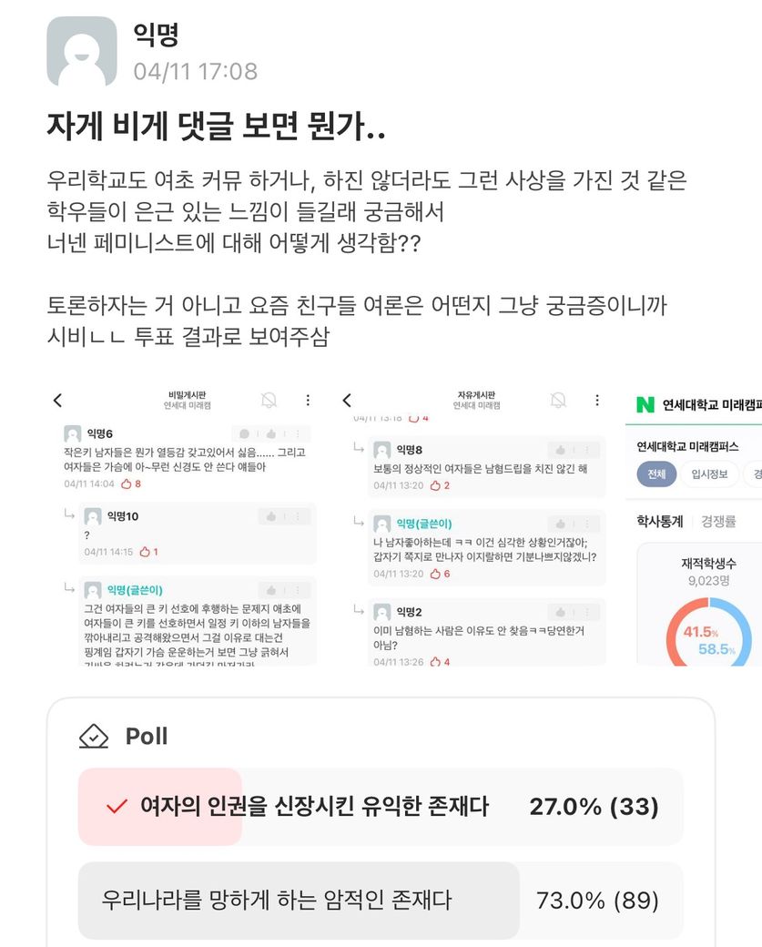 반복적으로 올라오는 편협한 투표글에 지쳐 이런 투표글 왜 자꾸 올라오냐는 말을 남겼을 뿐인데 망상 속 고정관념을 기반으로 저에게 욕설을 남긴듯합니다.