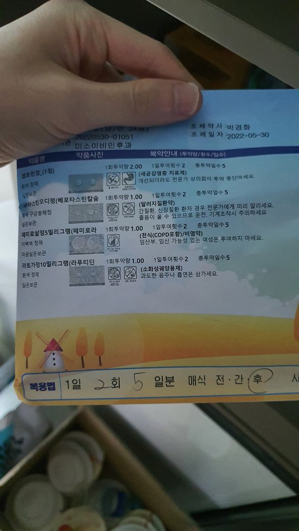 또한 2~3일 정도 약을 먹을 때 오후 2시에 밥 먹고 약 / 오후 6시에 밥 먹고 약