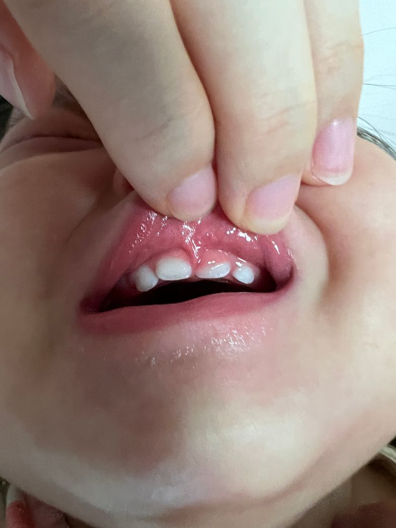 사진에 해당하는 해부학적 구조물은 순소대이고 자라면서 점차 잇몸 위쪽에 위치하게 됩니다. 입술이나 잇몸이 끼거나 한 것은 아니니 걱정하지 않으셔도 됩니다. 영유아 검진 잘 받으시기 바랍니다.