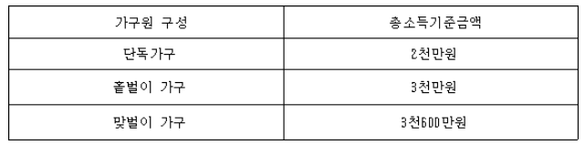 (단독: 2천만원 미만, 홑벌이: 3천만원 미만, 맞벌이: 3천6백만원 미만)
