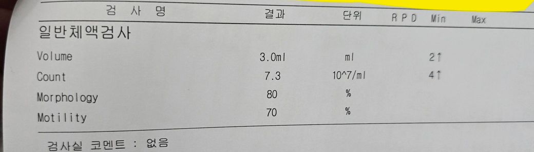Volume은 3.0ml로 측정되었으며, 정상 범위는 2ml 이상으로, 이 결과는 정상 범위 내에 있습니다. Count는 7.3 (단위: 10^7/ml)로, 정상 범위는 4 이상이며, 이 역시 정상 범위에 속합니다. Morphology는 80%로, 정상 범위에 속하는걸로 보입니다만 일반적으로 사용되는 기준은 면적 범위당 4%에요. 80은 뭘 기준으로 하는지 모르겠으나 정상일 확률이 커보여요. 정확한건 병원에 물어보시는게 좋을 듯 합니다