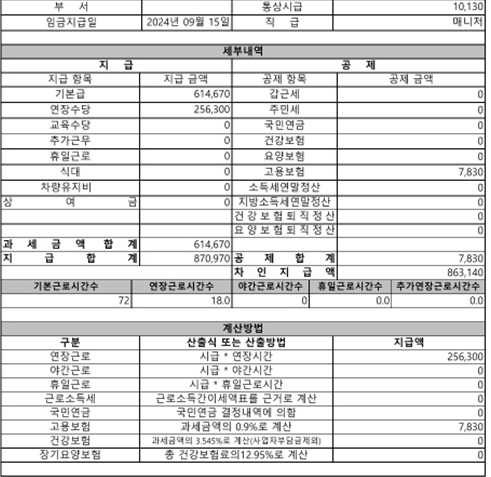 임금명세서 내용은 다음과 같습니다.