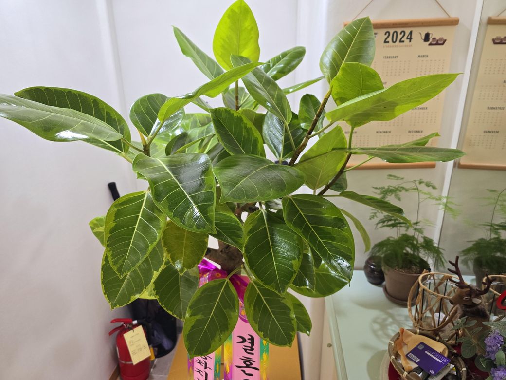 뱅갈고무나부 바리에가타 입니다. 뱅갈고무나무 바리에가타는 밝은 간접광에서 키우며 직사광선과 과도한 그늘을 피해야 합니다. 물은 흙이 거의 마른 후에 충분히 주고 과습을 막기 위해 배수에 신경 씁니다. 적합한 온도는 18에서 24℃이며 갑작스러운 온도 변화를 피해야 합니다. 공중습도를 유지하려면 잎을 분무하거나 주변에 물그릇을 두는 것이 좋습니다. 성장기인 봄과 여름에는 월 1에서 2회 비료를 주는 것이 효과적입니다.
