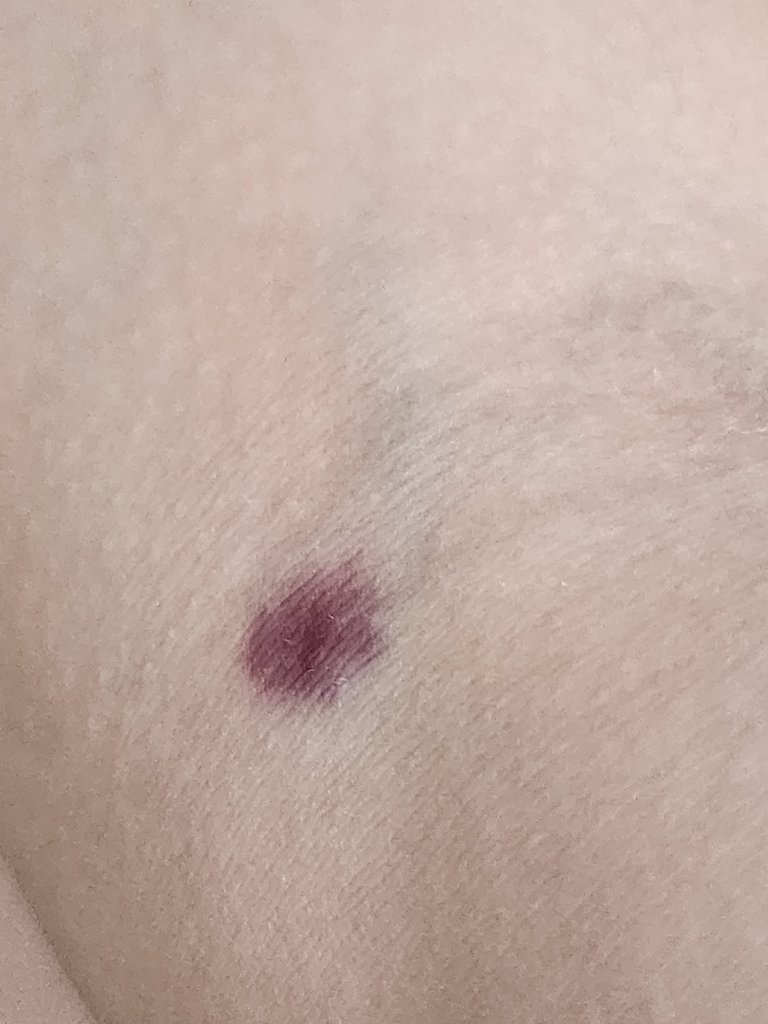 혈관 주사나 채혈을 하고 충분히 지혈을 하지 않아 발생한 출혈으로 보입니다. 시간이 지나면 호잔이 될것으로 사료가됩니다.