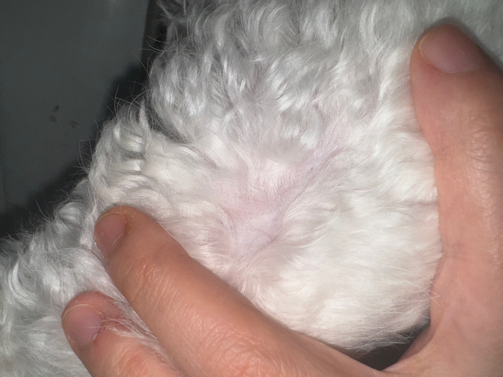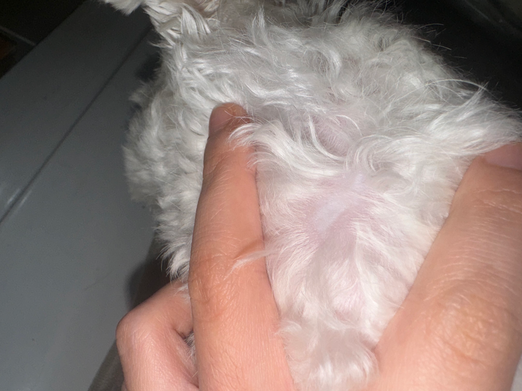 저희 집 강아지가 원래 좀 붉은끼 피부인데 털이 빠져있는 특정 부분은 상대적으로 밝습니다. 벌레에 물린 건지 탈모증상인지 모르겠습니다.