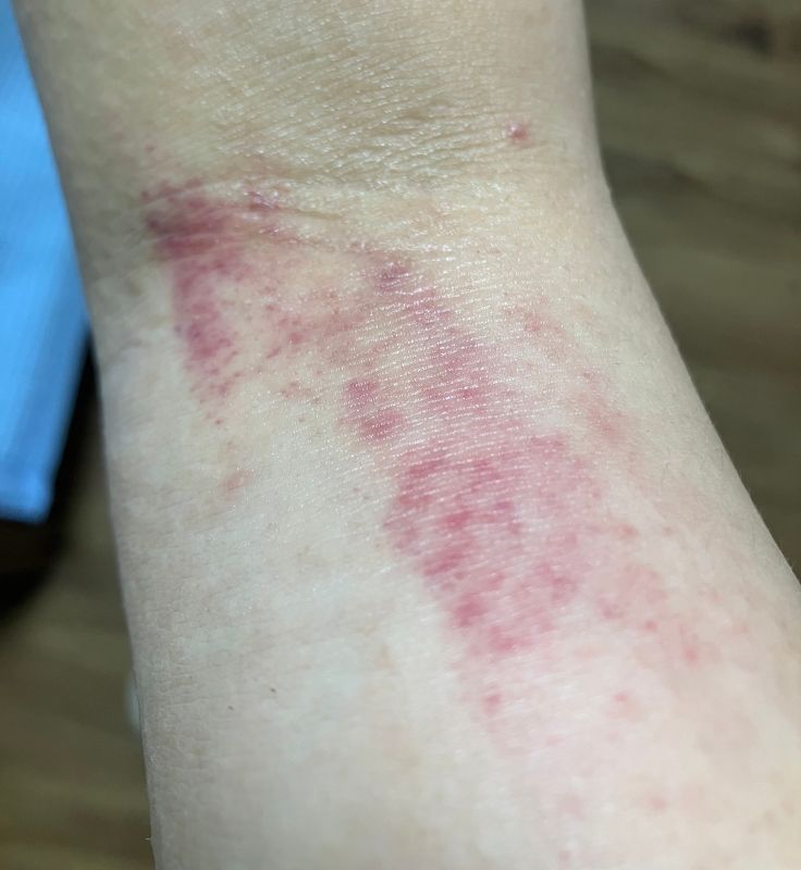 사진의 소견만으로 정확한 상태 평가를 할 수는 없지만 사진의 소견을 통해 볼 때에는 일시적인 접촉성 피부염 같은 문제일 가능성이 높아 보입니다. 스스로 회복될 가능성이 있어 경과를 지켜보셔도 무방해 보이나 혹시라도 차도가 없고 지속되거나 악화될 경우에는 피부과에서 치료를 받으시는 것이 좋겠습니다.
