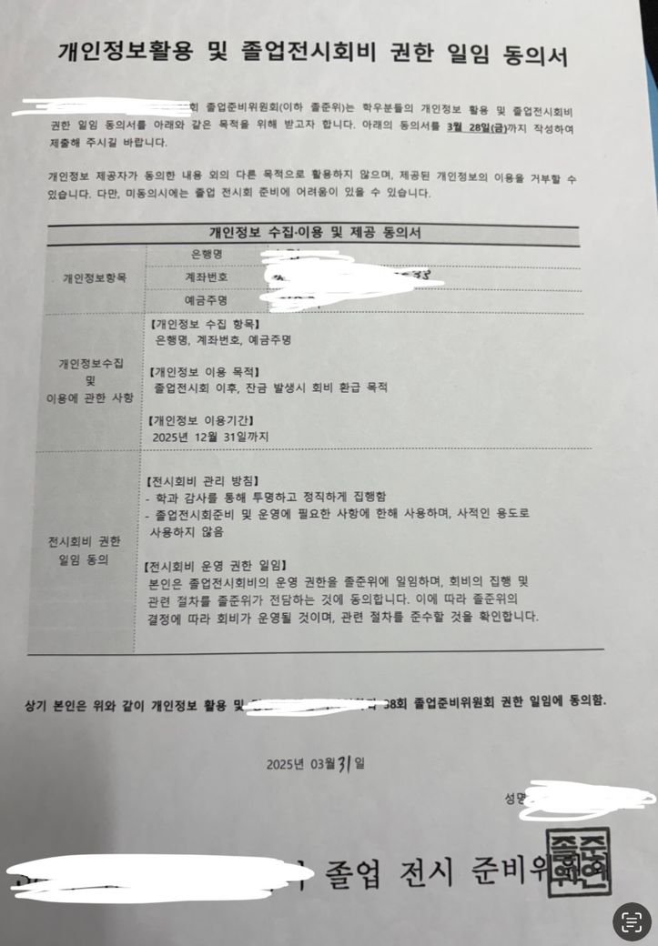 “ 졸업전시회비는 모든 학우분들이 졸업전시를 완수하겠다는 본인의 자발적인 의사로 납부한 금액이며, 그 전제와 운영 방침에 동의하여 동의서에 서명한 것입니다.