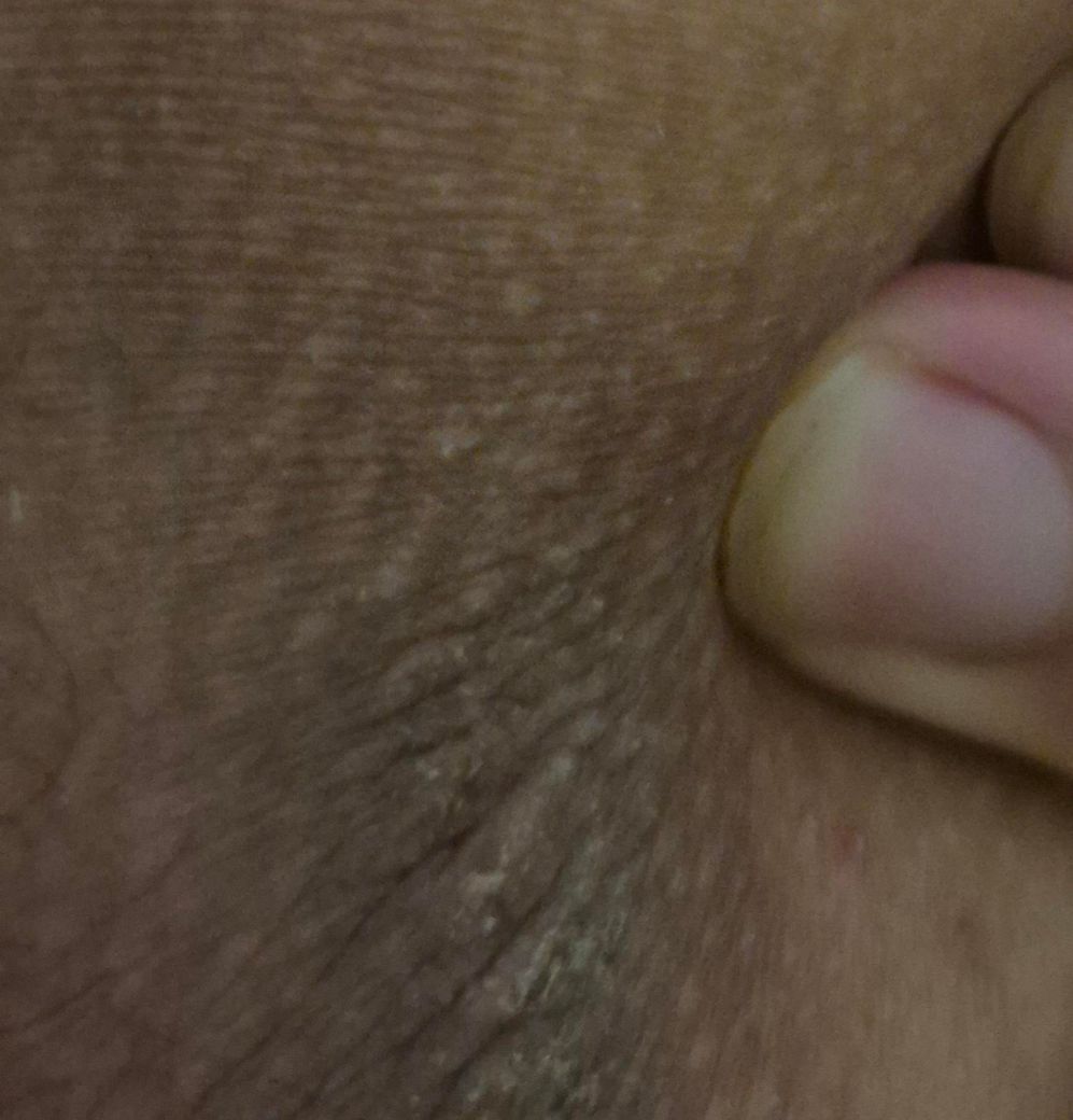 건조한 환경, 체중 부하 등으로 인하여 피지 분비가 왕성해지거나 피지 배출이 원활하게 되지 못하여 내부에 쌓여 있고, 쌓인 피지들이 층을 만들어 굳은, 딱딱한 피지 찌꺼기 양상의 각질 등이 형성된 것으로 보입니다.