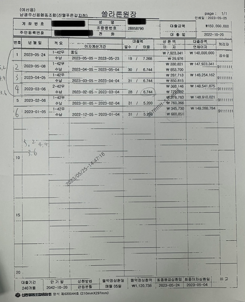 질문자님이 승계를 한후 1천만원을 3개월가량 밀려서 냈다고 하시지만 실제 대출상환은 조금씩 하셔서 2023년 1월 5일에 상환을 시작하여 2023년 5월 24일날 상환을 하셔서 총 10백만원의 상환을 완료하셨습니다. 그렇기 때문에 이자 계산은 1월 5일에 상환하기 시작한 일자를 시작으로 5월 24일까지 상환하신 날짜의 기간동안의 이자 금액에 대한 산정이 필요합니다.