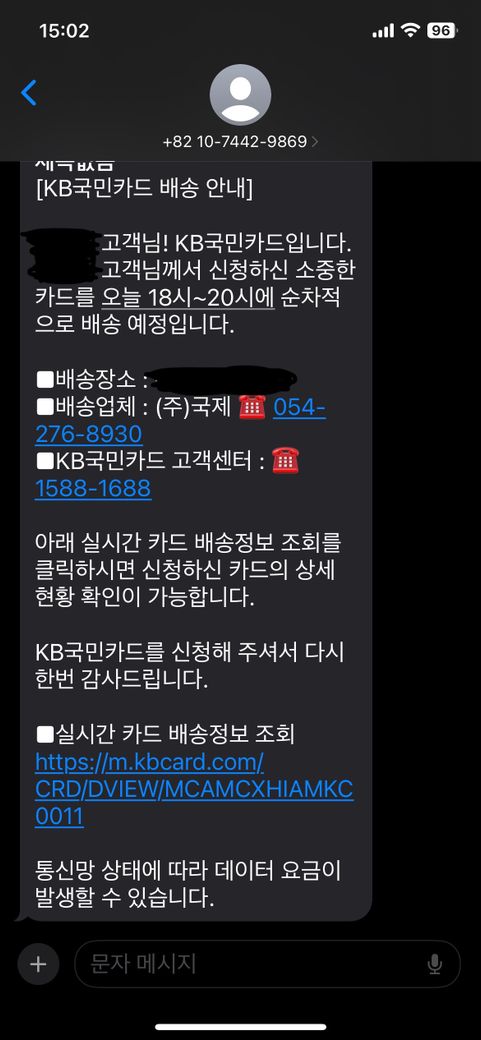 KB국민카드 신청 문자를 보니 번호는 맞지만