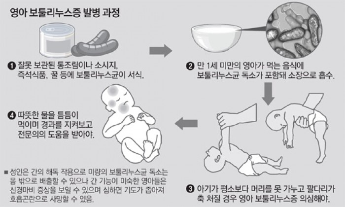 벌꿀은 자연식품으로 보툴리누스 균에 오염 되어 있을 수 있는데, 이 보툴리누스균의 포자가 소화기능이 발달하지 않은 영아의 장관에서 살아남아 증식해 신경독소를 생성하면서 심할경우 사망에 까지 이를 수 있게 합니다.