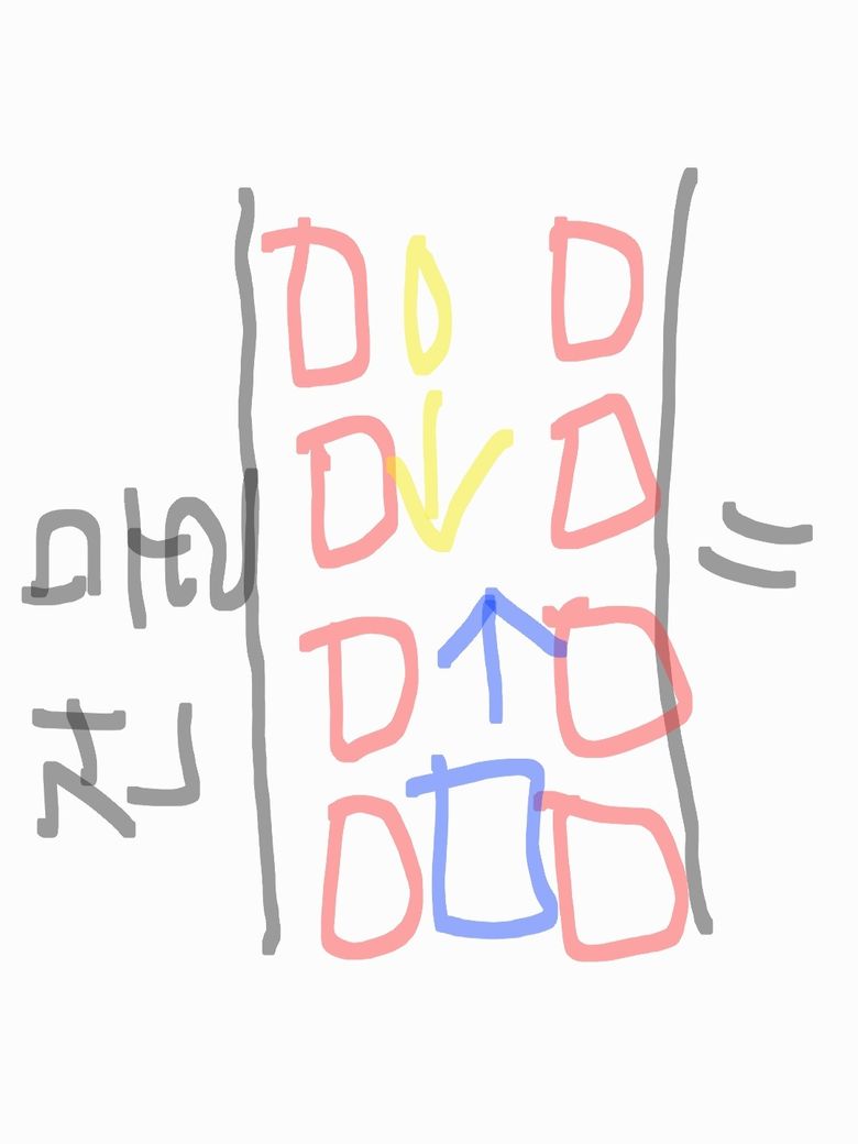양 옆에 건물들이 있고 그 앞으로 줄 지어서 갓길 주차(빨간색)가 되어 있는 좁은 폭의 도로에서 제 차(파란색)는 서행 중이었고 배달 오토바이(노란색)는 맞은편에서 제 차 쪽으로 주행 중이었습니다.
