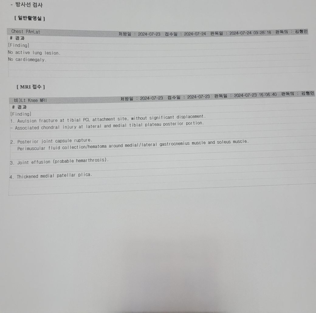 후방십자인대가 경골에 붙는 부위에 골절이 생기신듯 합니다. 힘줄이나 인대가 뼈에 붙는데 이 부착부위의 뼈가 부러지는걸 견열골절이라고 합니다. 이 골절이 일어나면서 주변 연골과 관절낭에도 손상 및 출혈이 고여있는듯합니다.