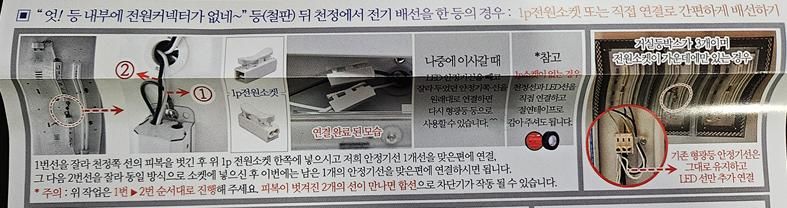 천장 안정기가 나간 김에 LED 등으로 교체하려고하는데 전원 커넥터가 바로 안보입니다. 철판 위에 있는거같은데, LED 등이랑 같이 온 설치방법 종이에 사진과 같이 그냥 이어서 하라고 적혀있는데, 이렇게 해도 상관없나요?