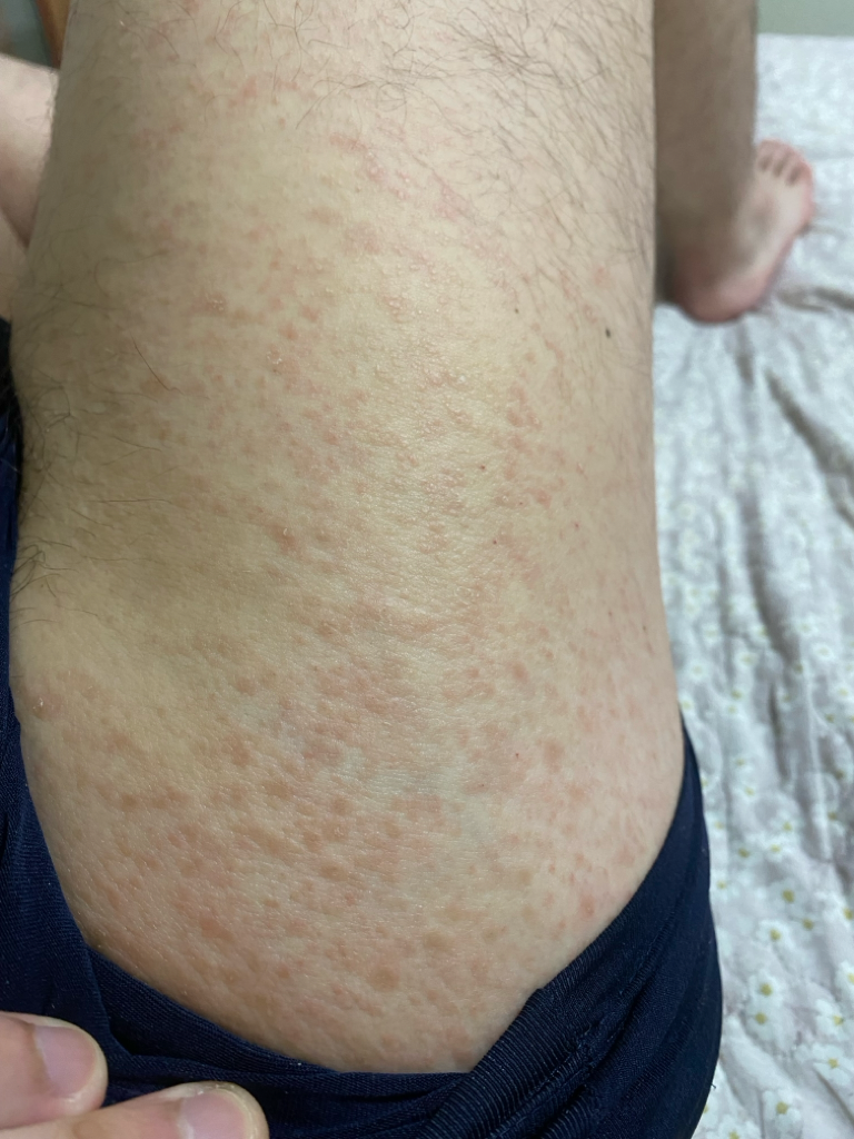 알레르기 반응에 의한 피부병변으로 보여집니다.