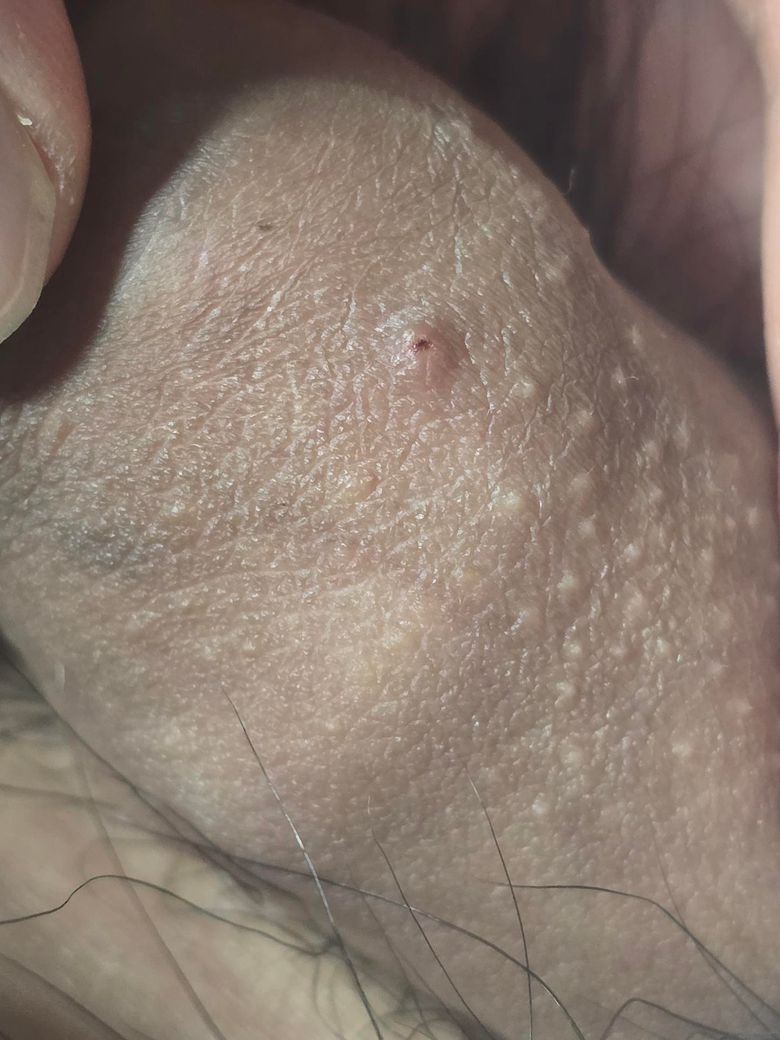 사진상 병변은 음경 피부에 생긴 작은 구진 형태로 보이며 중심에 미세한 구멍이나 딱지처럼 보이는 부분이 있습니다. 단일 병변이고 주변 피부와 경계가 비교적 명확한 점을 고려하면 다음 가능성이 흔합니다.