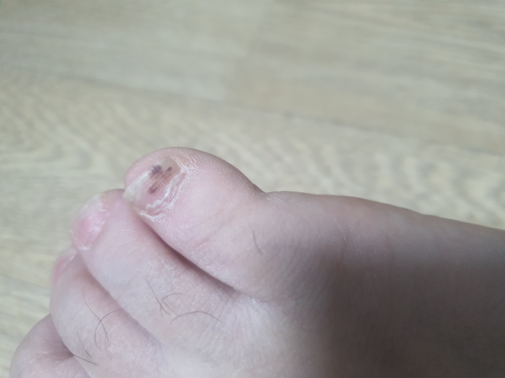 피부에 생기면 멍인데 발톱 밑에서 출혈이 생기다 보니까 사진에서처럼 보일 수 있습니다.