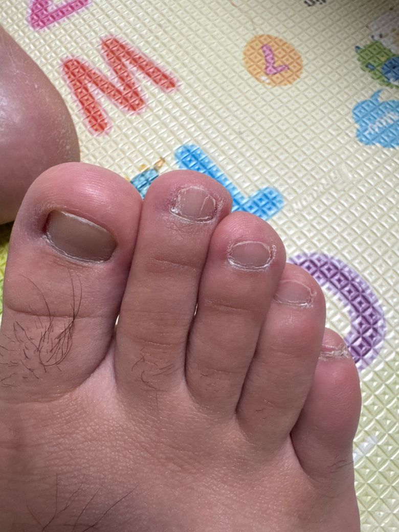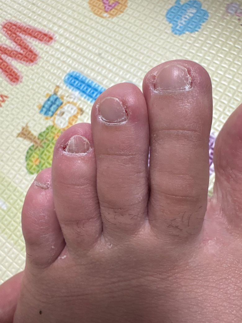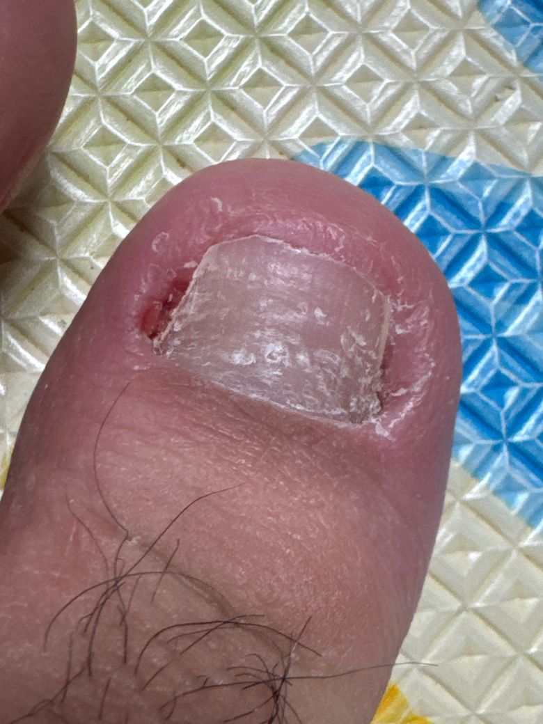 엄지 발톱에 내성 발톱이랑 무좀 균 떼어내고 싶어서 발톱을 이렇게 만들어 버렸습니다. 다른 발톱도 양 옆을 짤라내었고 무좀기가 보이는 것도 있습니다.
